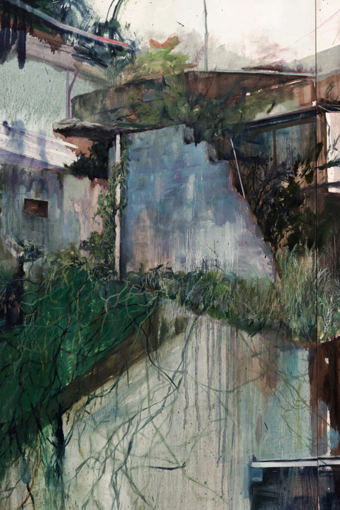 나는 큰 행사가 개최된 지역에 살았는데, 행사가 끝난 뒤 높은 건물들이 생겨나면서 사람들은 그곳으로 보금자리를 옮겼다. 그 행사로 바뀐 것은 기존 건물에서 사람들이 빠져나간 것 정도였다. 남겨진 건물들은 사람의 손길이 닿지 않고 시간의 흐름 속에 자연에 의해 본래의 형태를 천천히 잃어갔다. 나는 비로소 그때부터 건물이 하나의 생물이 되어, 자연과 어우러져 유기체적 상황을 만든다는 느낌을 받았다. 얽히고설킨 자연과 건물, 기존의 형태를 잃어가며 생겨나는 곡선, 때로는 필요에 의해 엉성하게 개조된 건물이 보여주는 조화는 유기체적 상황이 충분히 드러난다. 이 형상들은 조경 목적으로의 아이러니한 자연이 아닌 날것 그대로의 자연으로 생태계를 만들어간다. 물감을 비비거나 뿌리고 중력과 다른 방향으로 흐르게 하는 등 밑의 레이어가 보이거나 섞여 경계가 허물어지는 여러 가지 방식을 사용하여 그림을 그려 냈는데, 건물이 부식되고 자연으로 덮이는 레이어와 유사하다. 화면 위에서 물감이 만들어내는 유기체적 상황을 느끼며 작업을 진행한다.