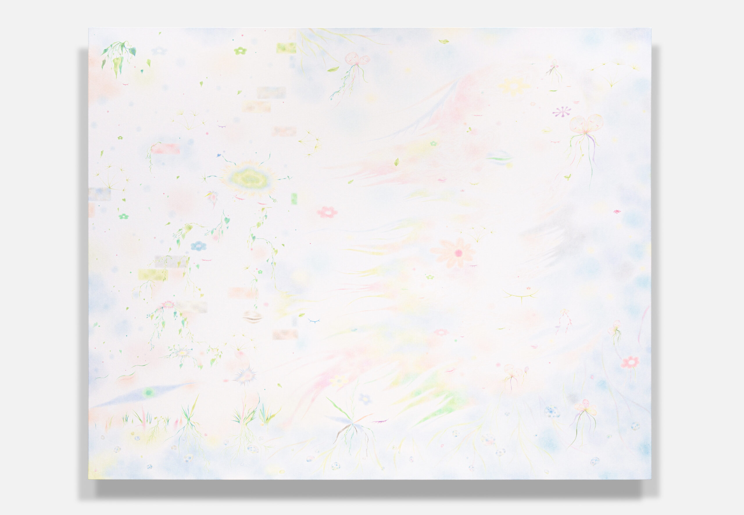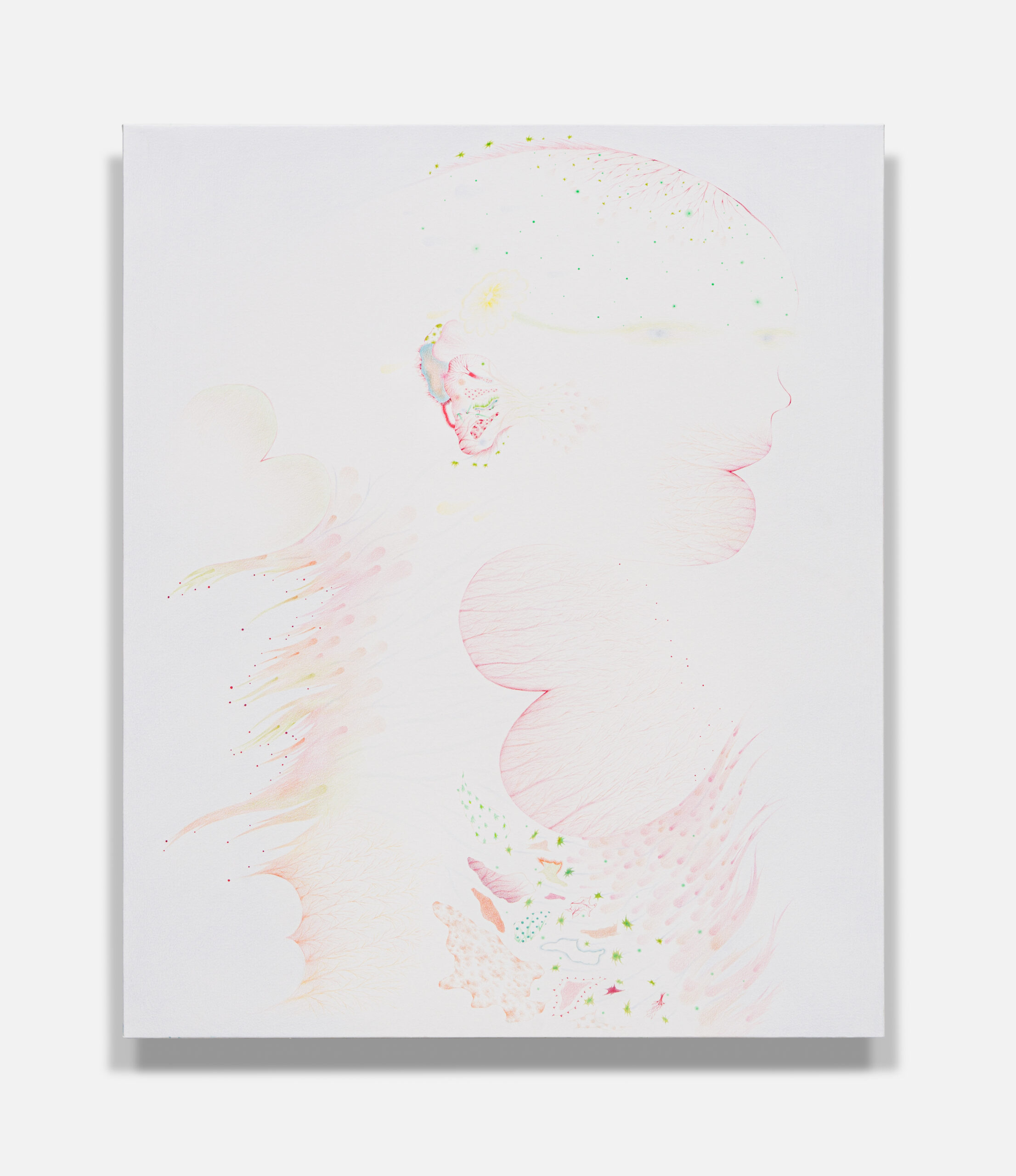 색연필은 그 과정을 닮아 있는 도구다. 보일 듯 말 듯 쌓여가는 색은 사라지지 않고 마음속에 남은 감정의 흔적을 닮았다. 가까이 다가가야 보이는 작은 유기체들은 그 자체가 내면에서 피어나는 생명력과 같다. 그리고 현실의 색과 거리가 먼 밝기만 한 색들은 조금씩 왜곡된 기억을 보여준다.