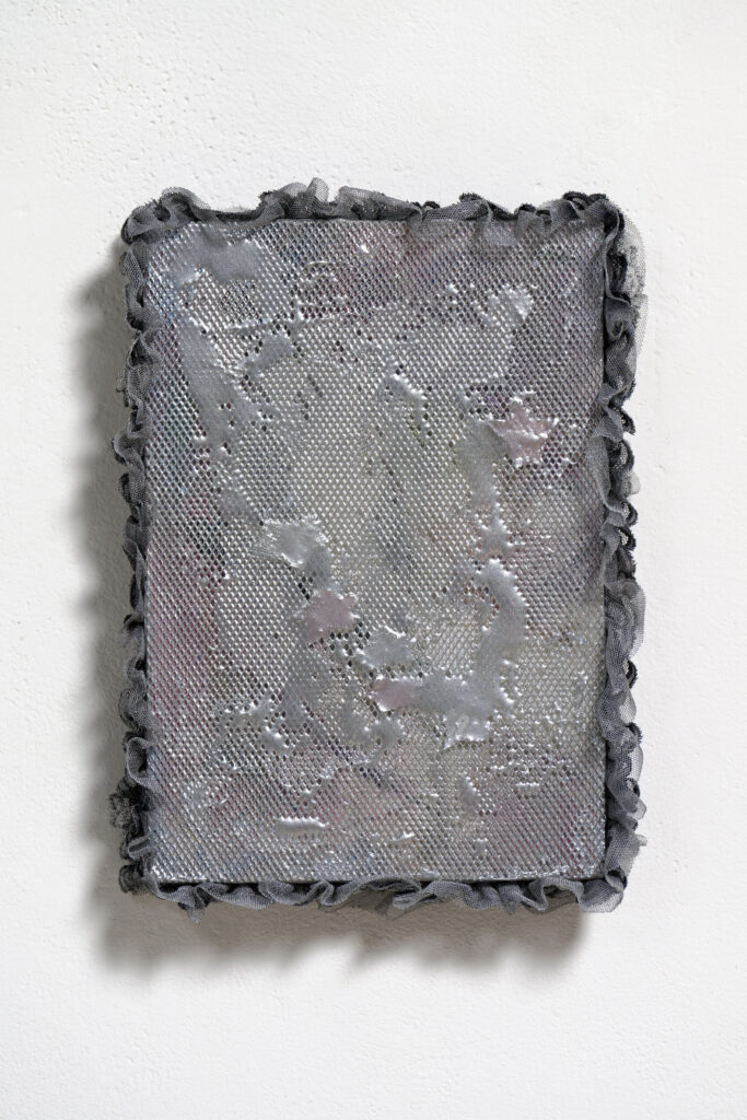 작업은 재료의 물성과 화면 구성의 관계성에 대한 실험에서 시작한다. 드로잉에 의상 제작에 쓰이는 소재나 철망과 같은 비 미술 재료를 콜라주 하거나 아크릴 미디엄을 쌓아 올린다. 이 과정을 통해 각 형상은 다른 미디엄으로 콜라주 되거나 펴 발라져 층이 생기고, 그 아래의 요소를 관찰하도록 유도하는 장치로 작용한다. 두 손의 감각을 따라 표상들이 탈락하거나 보존되고, 우연으로 결합하며 이미지가 완성된다. 나는 그곳 아래 원본을 숨겨두고, 이 시대에서 내가 외부 세계를 어떻게 받아들이고 있으며 그로 인해 무엇이 소멸하고 탄생하는지 기록한다. 반복되는 무수한 것들 사이에서 우리가 어떤 불규칙성을 가지고 있는지 발견하며, 그렇게 서로 연결될 수 있기를 소망한다.